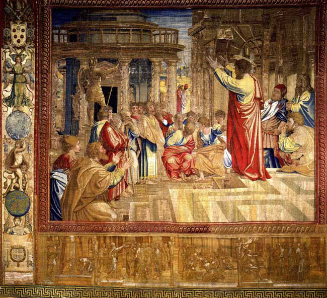 «رافائل» این پردههای نگارین را به سفارش پاپ آن دوره و برای به تصویر کشیدن زندگی «سنت پیتر» و «سنت پائول» نقاشی کرد. این آثار هنری در ۲۶ دسامبر سال ۱۵۱۹ در کلیسای «سیستین» و با حضور «رافائل» به نمایش گذاشته شدند. به احتمال زیاد این آخرین مرتبهای بوده که «رافائل» پردههای نگارین را دیده است؛ چراکه او چهار ماه بعد و در سن ۳۷ سالگی درگذشت.