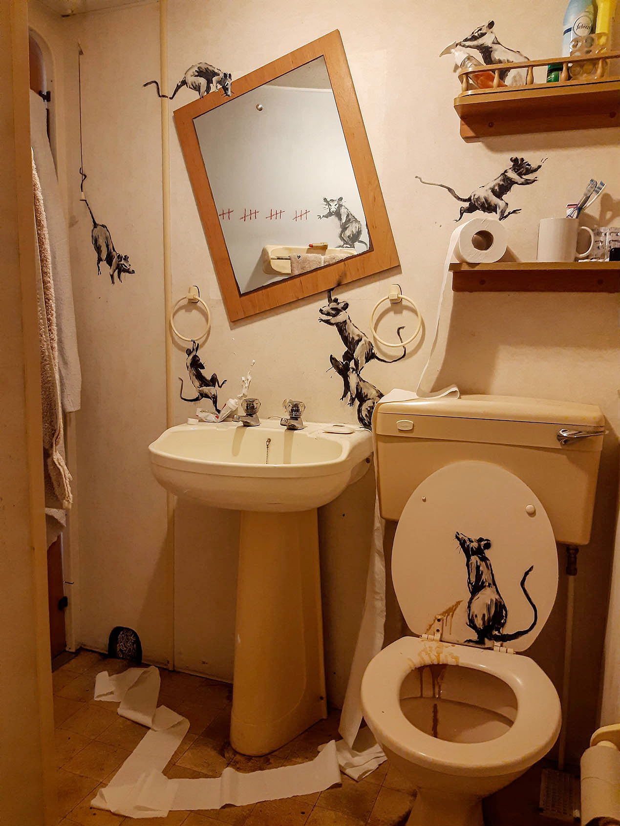 در این تصاویر جدید که در دوران قرنطینه در پی شیوع ویروس کرونا خلق شده است، موشهایی که پیشتر در بسیاری از آثار این هنرمند به تصویر کشیده شده بودند در حال بازیگوشی بر روی دیوار خانهاش نقش بستهاند. یکی از این موشها از حلقهای آویزان شده و دیگری روی خمیر دندان پا گذاشته است.