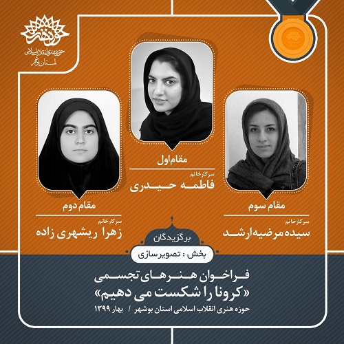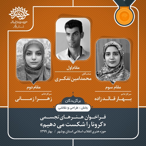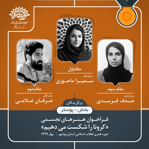 در بیانیه هیئت داوران آمده است: پس از انتشار فراخوان هنرهای تجسمی «کرونا را شکست می دهیم» توسط حوزه هنری انقلاب اسلامی استان بوشهر، در بخش های کاریکاتور، پوستر، تصویر سازی، خوشنویسی، نقاشی و طراحی از سمت استان و کشور کارهای خوبی توسط دبیرخانه دریافت شد.
