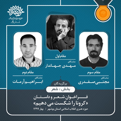 هیات داوران فراخوان ملی شعر (ما کرونا را شکست می دهیم) با تکیه بر موارد فوق، نتایج خود را به شرح ذیل اعلام می دارد :«مهدی جهاندار» از اصفهان، «ابراهیم آرمات» و «مجتبی صفدری» از میناب، به ترتیب مقام اول تا سوم را در بخش شعر کسب کردند.