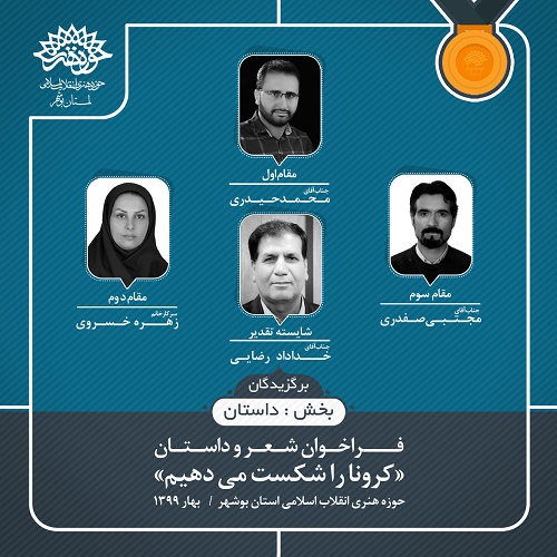 به گزارش روابط عمومی حوزه هنری استان بوشهر، دبیرخانه فراخوان شعر و داستان حوزه هنری انقلاب اسلامی استان بوشهر، طی بیانیه هیئت داوران، از بین آثار رسیده به دبیرخانه، 3 اثر را در بخش شعر و 4 اثر را در بخش داستان، به عنوان آثار برتر معرفی کردند.