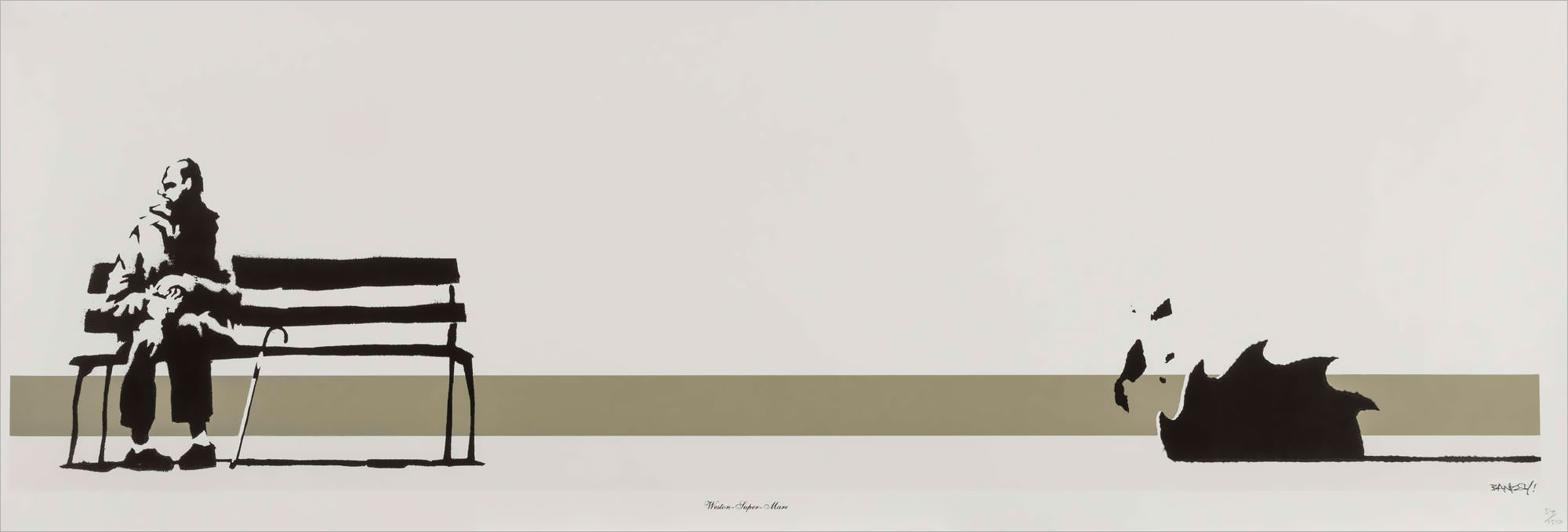 بنکسی در وستون سوپر مار یک شهروند سالخورده را تصویر می‌کند که روی نیمکتی کز کرده و به هیچ وجه متوجه خطر ارّه دیسکی که به او نزدیک می‌شود، نیست. این ارّه نمادی از مرگ است که بر حیات فانی تک‌تک انسان‌ها سایه انداخته بدون این که متوجه آن باشند.