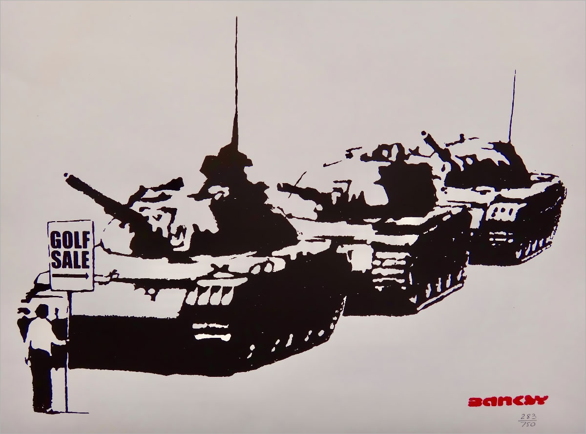 حراجی گلف (۲۰۰۳) یکی از اولین آثار بنکسی است که وی در آن تصویر ایستادگی یک مرد در برابر تانک‌های میدان تیان‌آن‌من که به عنوان یکی از نمادهای تاریخی اعتراض سیاسی شناخته می‌شود، را به فراخور نقد از فرهنگ مصرف‌گرایی تغییر داده است.