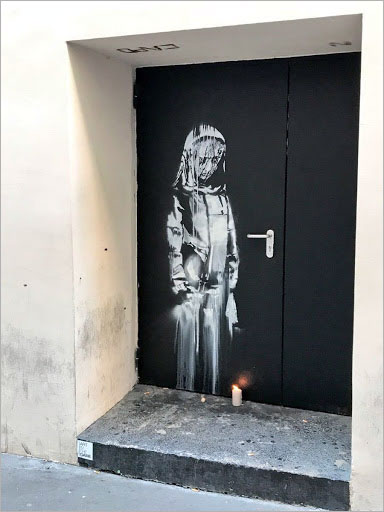 به گزارش روابط عمومی مرکز تجسمی حوزه هنری، بنکسی در گرامیداشت یاد ۹۰ قربانی حمله تروریستی سال ۲۰۱۵ نیروهای داعش به سالن نمایش بتکلان (Bataclan) پاریس، روی یکی از درهای خروج اضطراری این سالن اثری را کشیده بود که ژانویه گذشته (دی-بهمن ۹۷) به سرقت رفت.