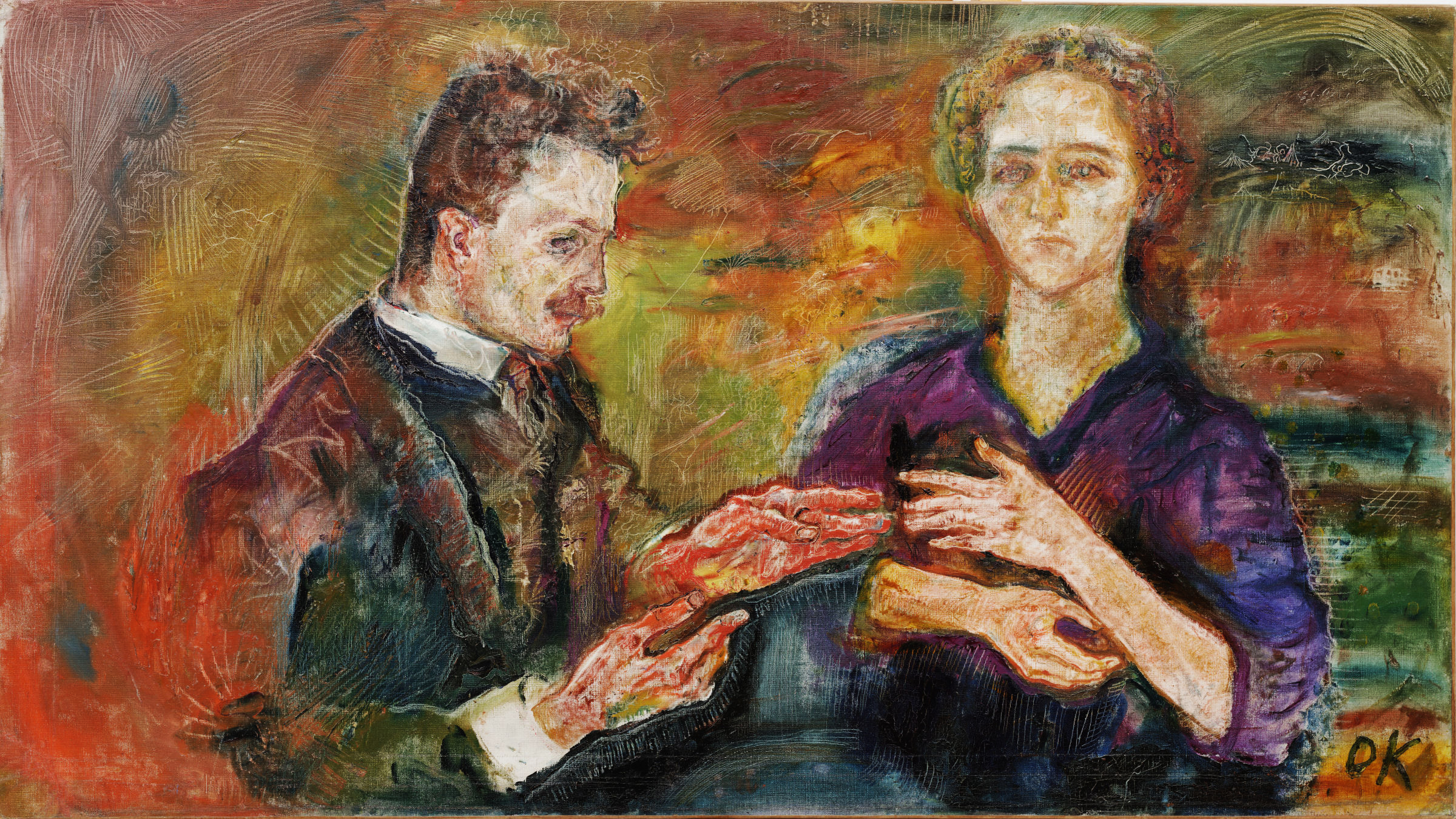 کوکوشکا از هنرمندان برجسته اکسپرسیونیسم است که در ترسیم چهره ها سعی در نشان دادن شخصیت و حساسیت درونی آدم‌ها دارد و این موضوع بیشتر متاثر از شخصیت حساس خود اوست. در این تابلو پیکرها در پس‌زمینه آزاد کار شده‌اند و حرکت ظریف دست های هانس و همسرش اریکا بیانگر حالت روحی این دو و حساسیت نهفته در پسِ چهره متفکرآن هاست.