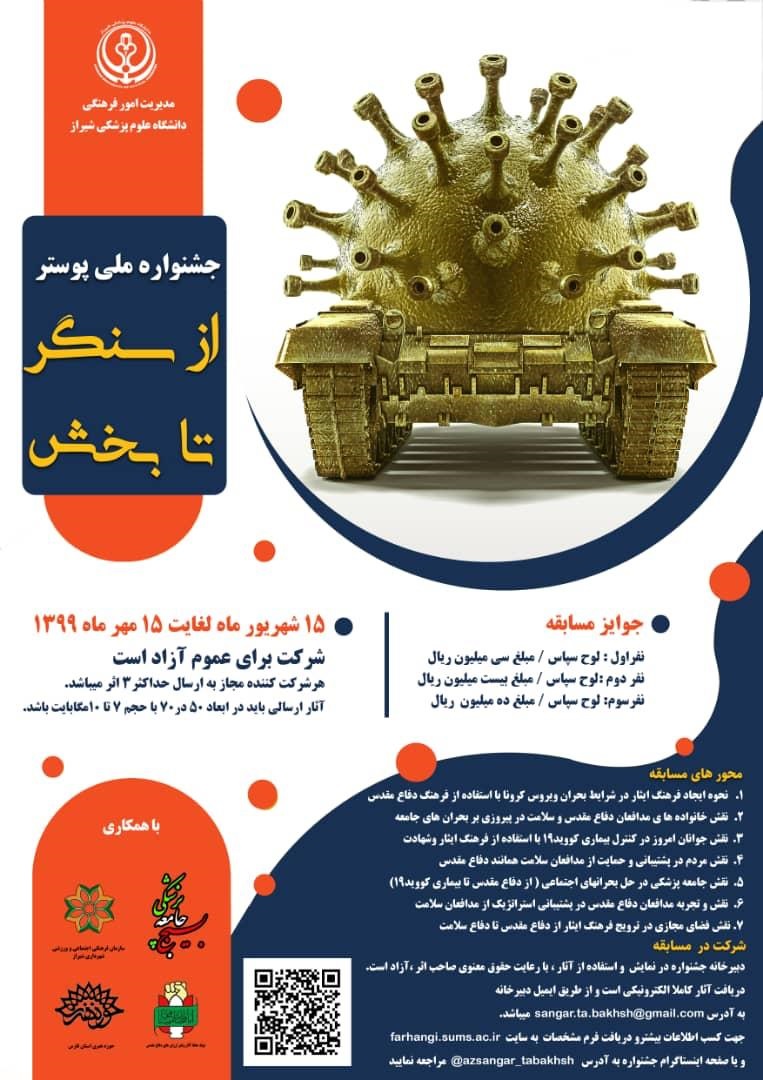 به مناسبت هفته دفاع مقدس، جشنواره ملی پوستر به میزبانی مدیریت فرهنگی دانشگاه علوم پزشکی شیراز برگزار میگردد.