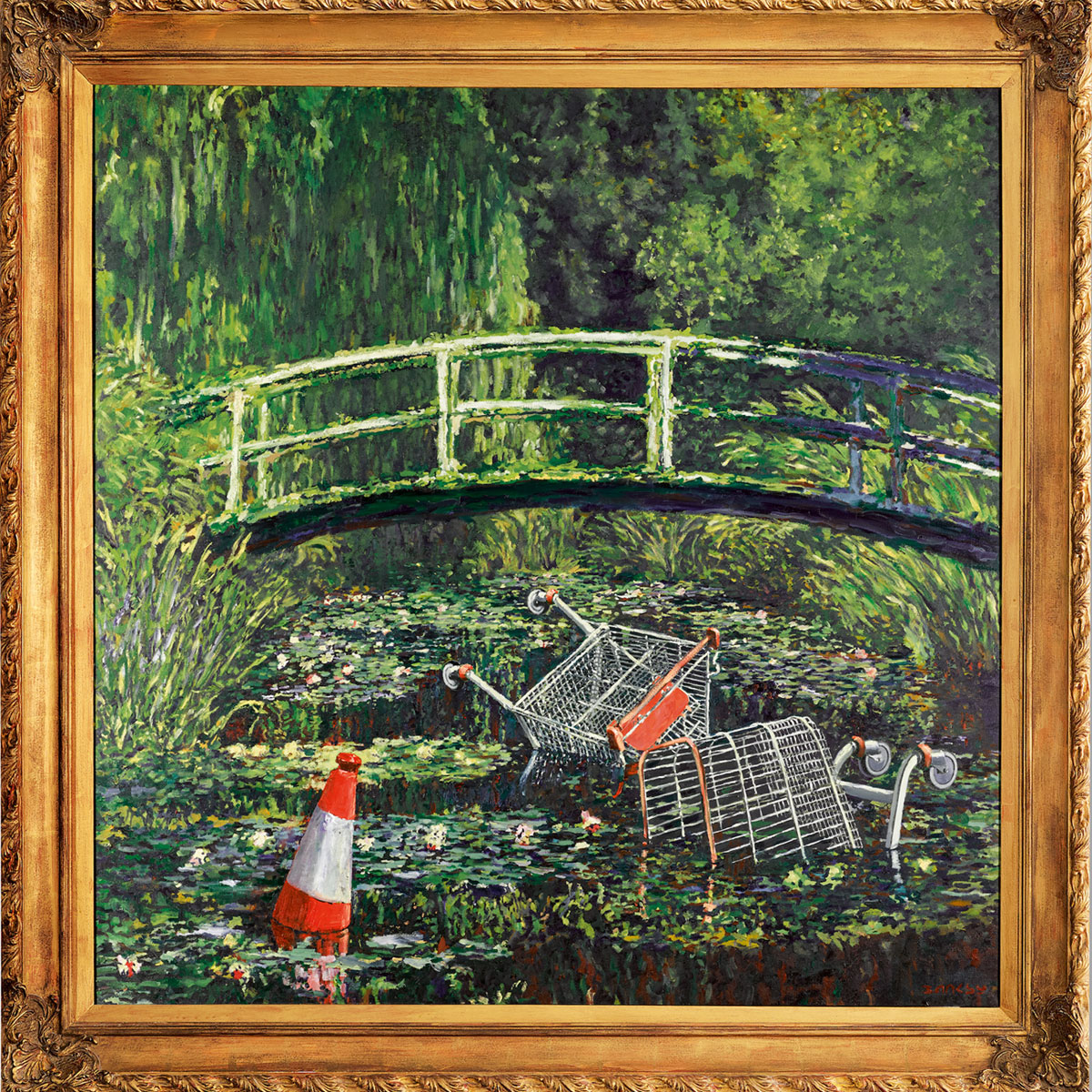 در این نقاشی که محصول سال ۲۰۰۵ است، بنکسی چرخهای خرید رهاشده و یک مخروط ترافیکی نارنجی را به تابلوی زمینهای از «کلود مونه»؛ نقاش مشهور فرانسوی، که از نیلوفرهای آبی باغچه خود در «گیوِرنی» کشیده بود، اضافه کرده است.