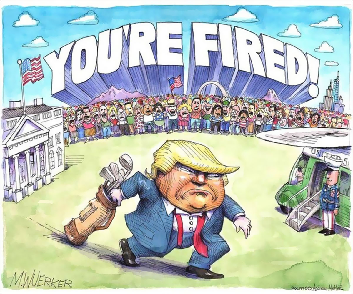«آدام زایگلیس» کاریکاتوریست برنده جایزه پولیتزر از کسانی بود که با اعلام نتایج اولیه انتخابات به این موضوع واکنش نشان داد. در اثر این کاریکاتوریست، ترامپ در حالی که قصد ندارد از ریاست جمهوری آمریکا دست بکشد به تصویر کشیده شده است.