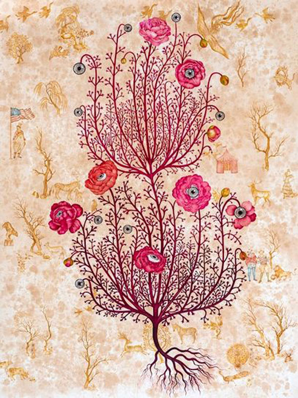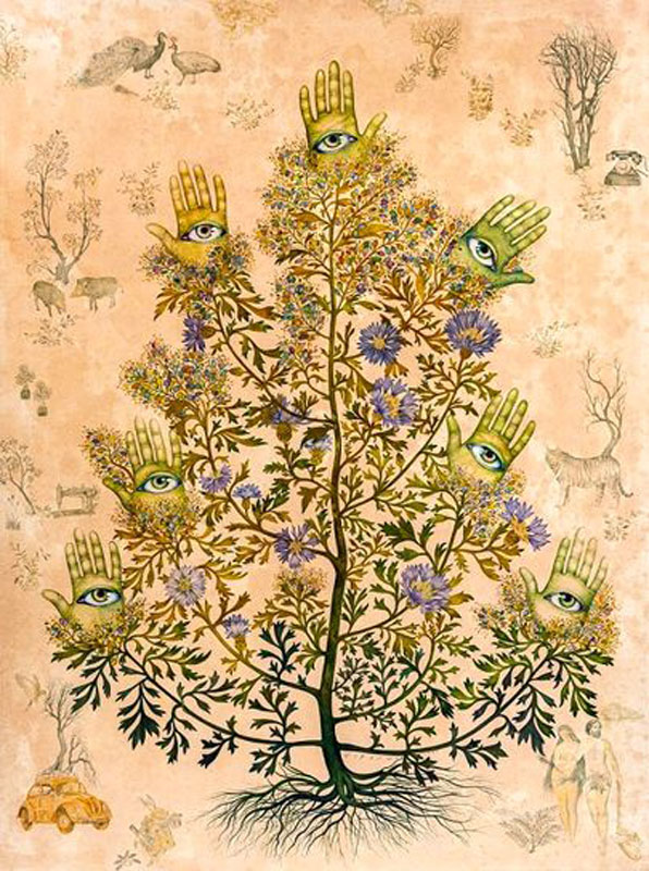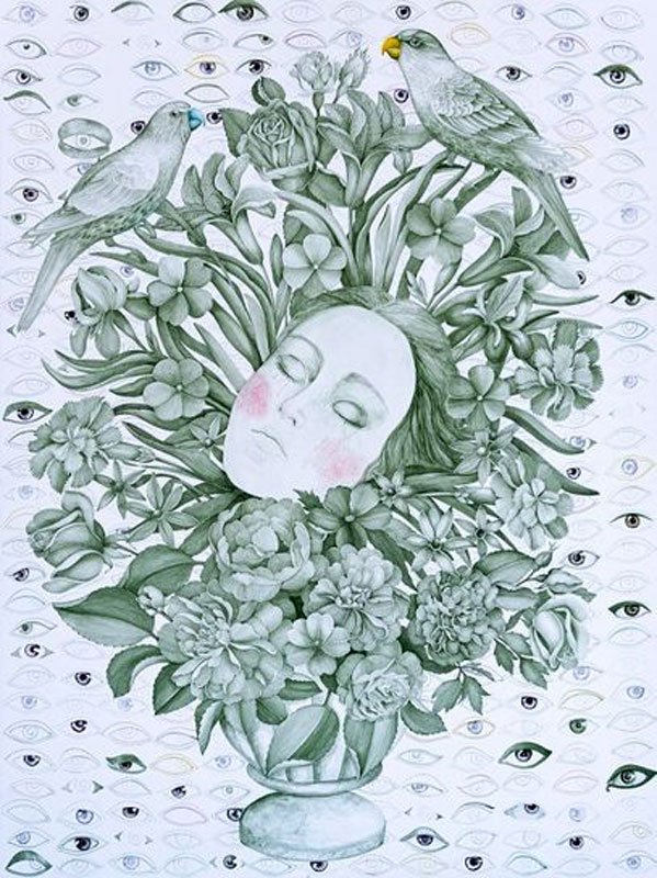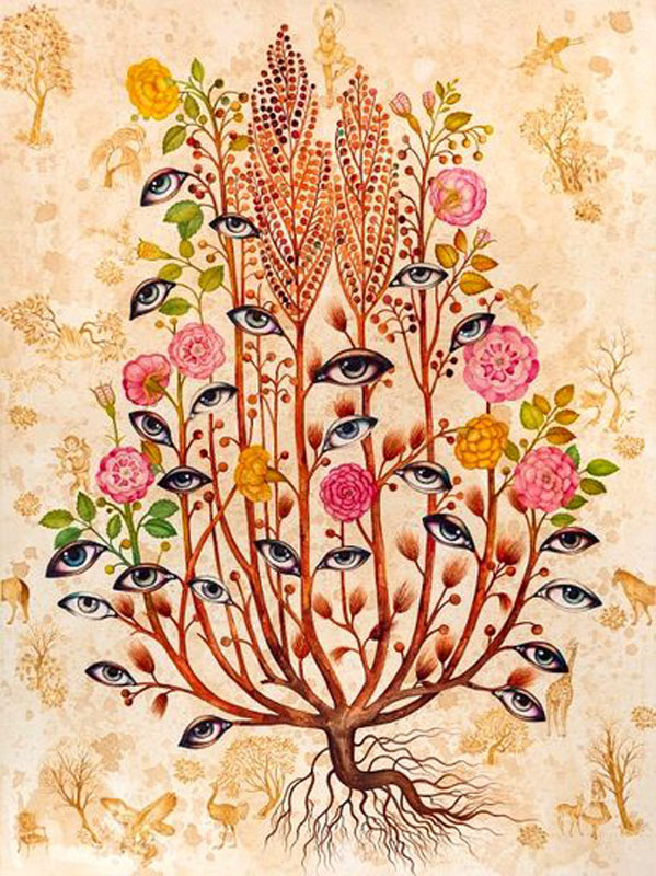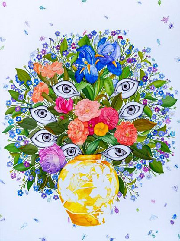 او با بیان اینکه هر مجموعه‌اش تفاوت‌های زیادی با مجموعه قبلی دارد گفت: موضوع کلی این نمایشگاه نظاره‌گر بودن است و با توجه به اینکه من علاقه زیادی به اسطوره‌ها دارم و در این زمینه مطالعه می‌کنم، در این مجموعه از میترا، الهام گرفتم که یک خدای اسطوره‌ای است و در متون قدیمی آمده است هزاران گوش و چشم داشته و نظاره‌گر رفتار انسان بوده است. این نظاره‌گری را در المان‌های مختلفی مانند بوته‌های پر از چشم یا طبیعت بی‌جان‌هایی که چشم‌های نظاره‌گر دارند نشان دادم و مخاطب احساس می‌کند این عناصر در حال نگاه کردن به او هستند.