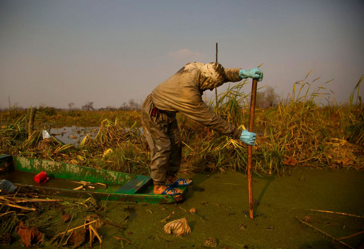 کشاورزی که در یک روز سرد از آبهای آلوده دریاچهای در کشمیر گیاه خارج میکند / هند - اسوشیتدپرس