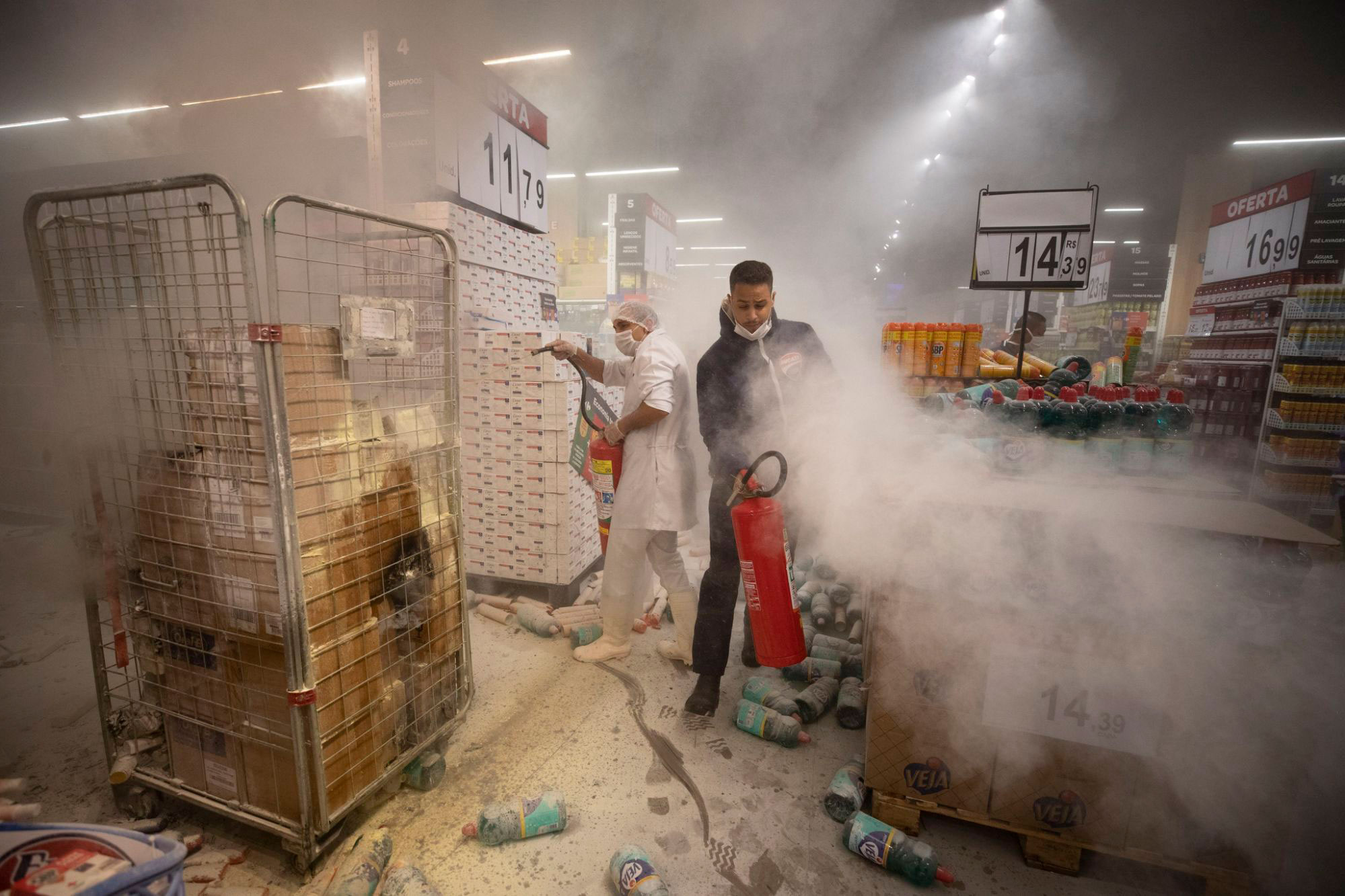 کارکنان یک سوپرمارکت درحال خاموش کردن آتشی که در جریان تظاهرات در واکنش به کشته شدن آلبرتو سیلویرا؛ یک مرد ۴۰ ساله سیاهپوست، ایجاد شده است / بزریل – اسوشیتدپرس