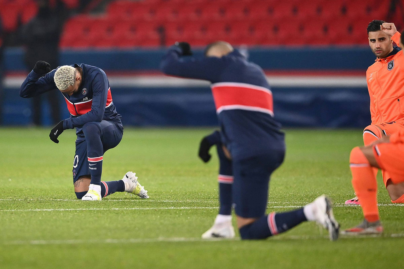 «نیمار» به همراه سایر بازیکنان «پاری سن ژرمن» و «باشاکشهیر» پیش از آغاز بازی با هدف حمایت از جنبش «جان سیاهپوستان مهم است» زانو زدهاند. / فرانسه - خبرگزاری فرانسه