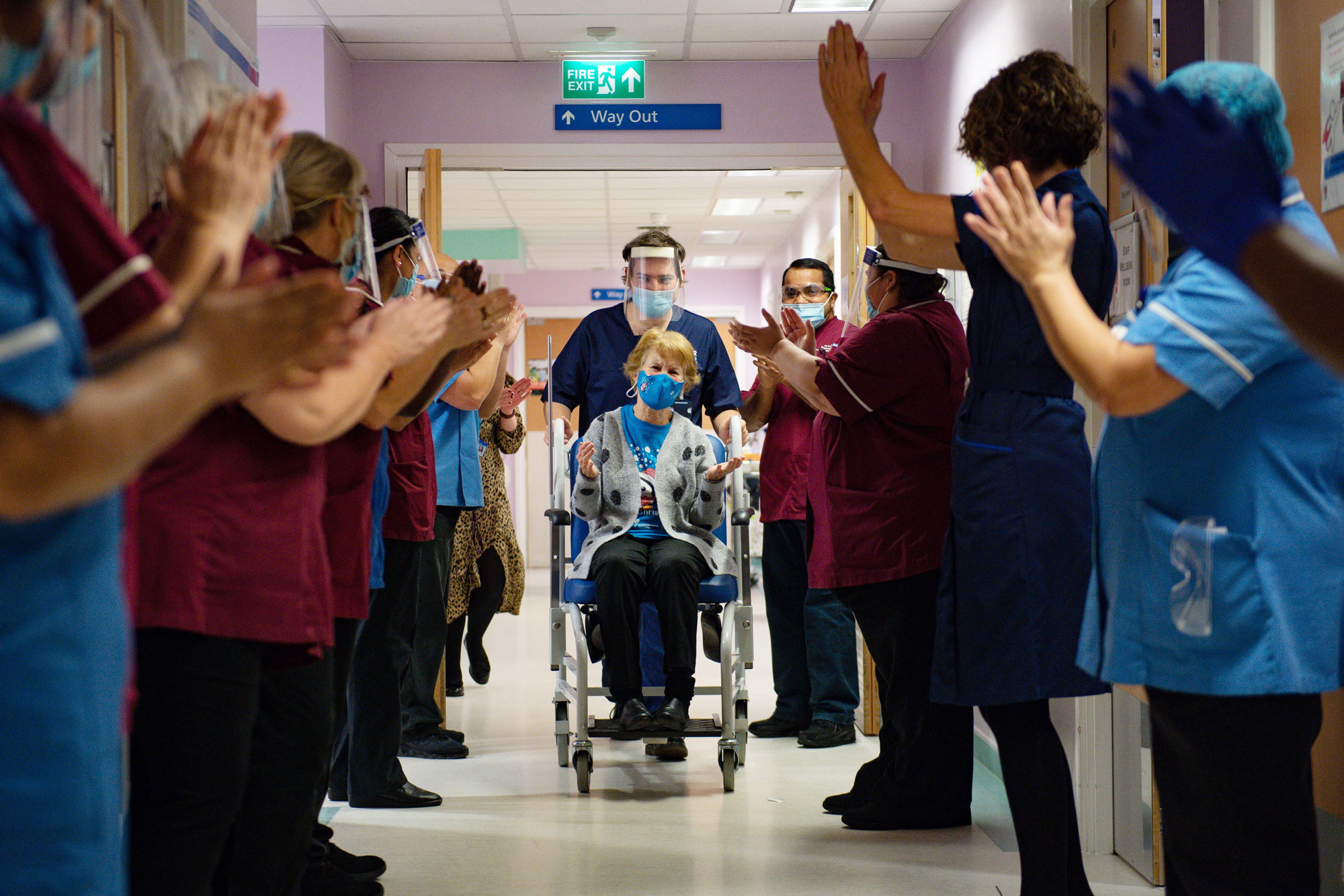 تشویق پرسنل بیمارستان برای «مارگارت کنان» نخستین فرد دریافت کننده واکسن کرونا همزمان با واکسیناسیون. / انگلستان