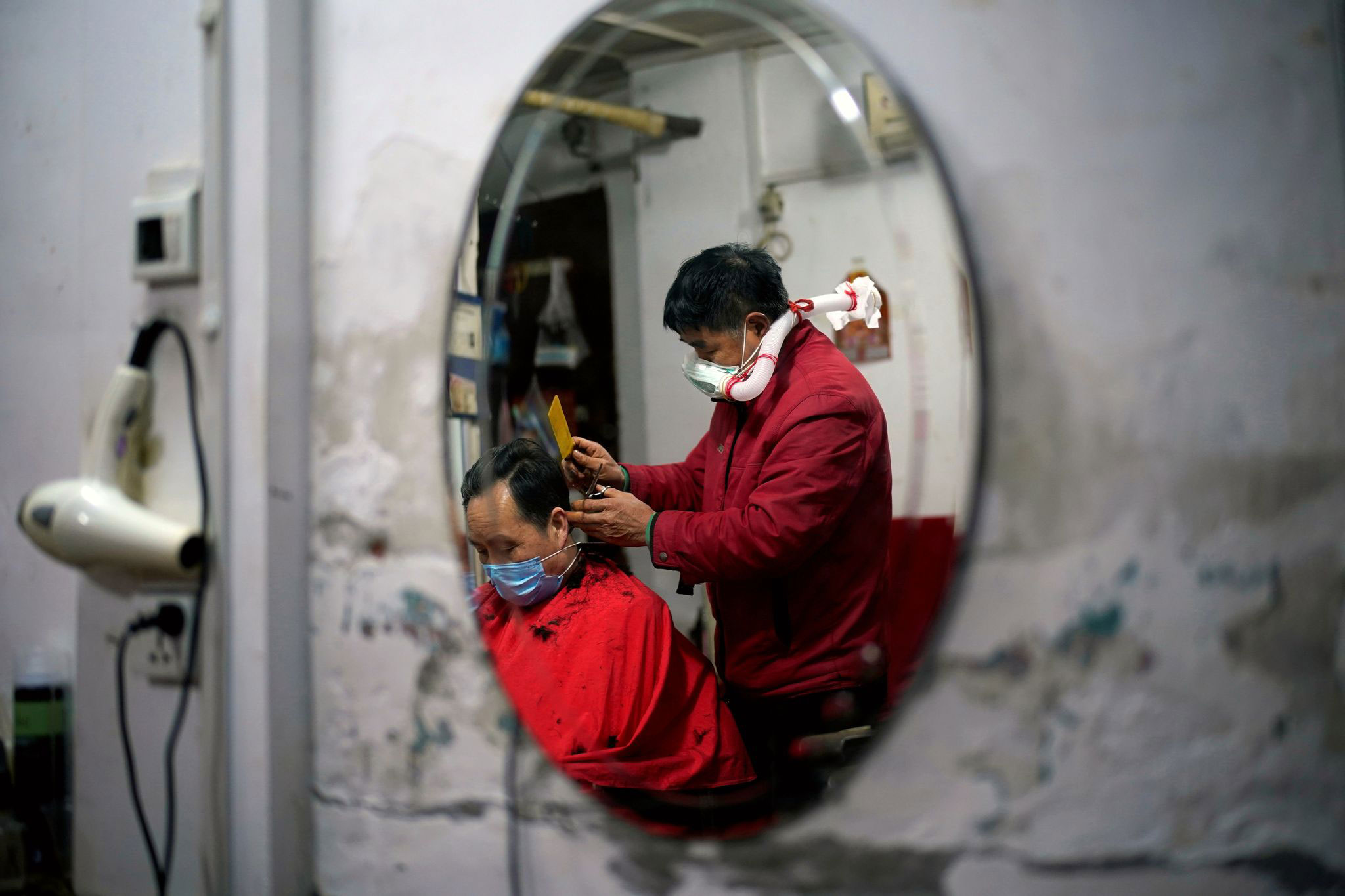 یک آرایشگر در «ووهان» با استفاده از ماسک دستساز متشکل از بطری آب، ماسک و لوله پلاستیکی مشغول کار است / چین / ۱۱ آوریل۲۰۲۰