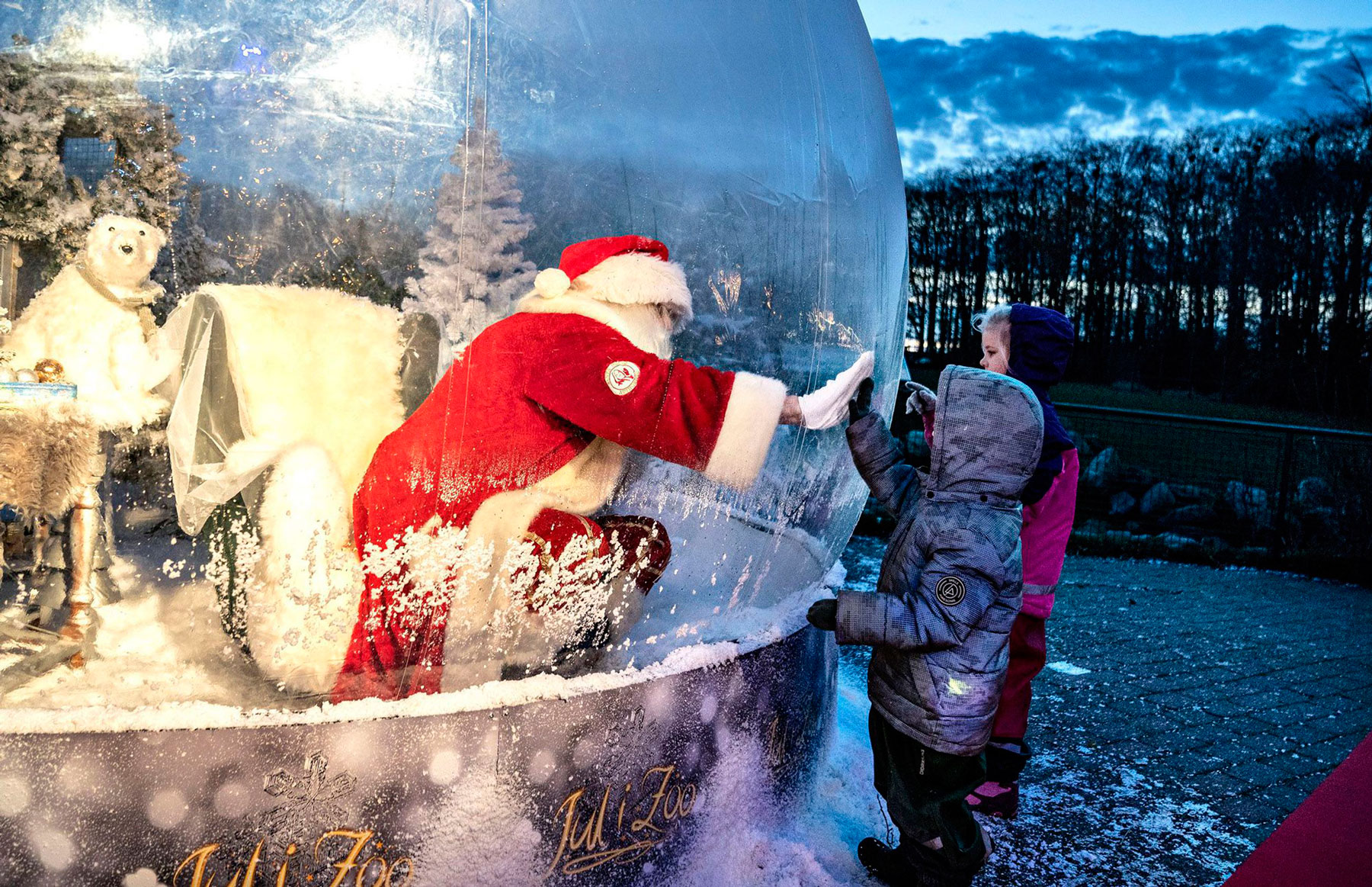 شخصی که لباس بابانوئل بر تن دارد از داخل محفظهای با کودکان ملاقات میکند / دانمارک / ۱۳ نوامبر