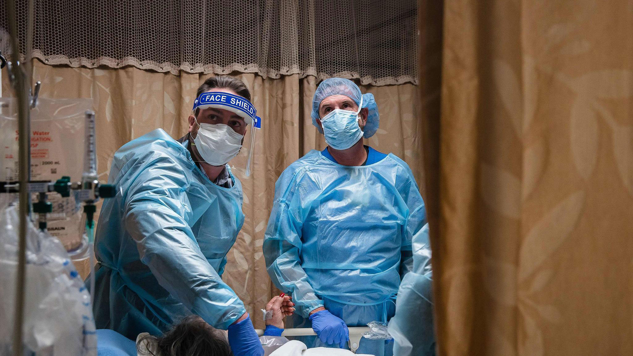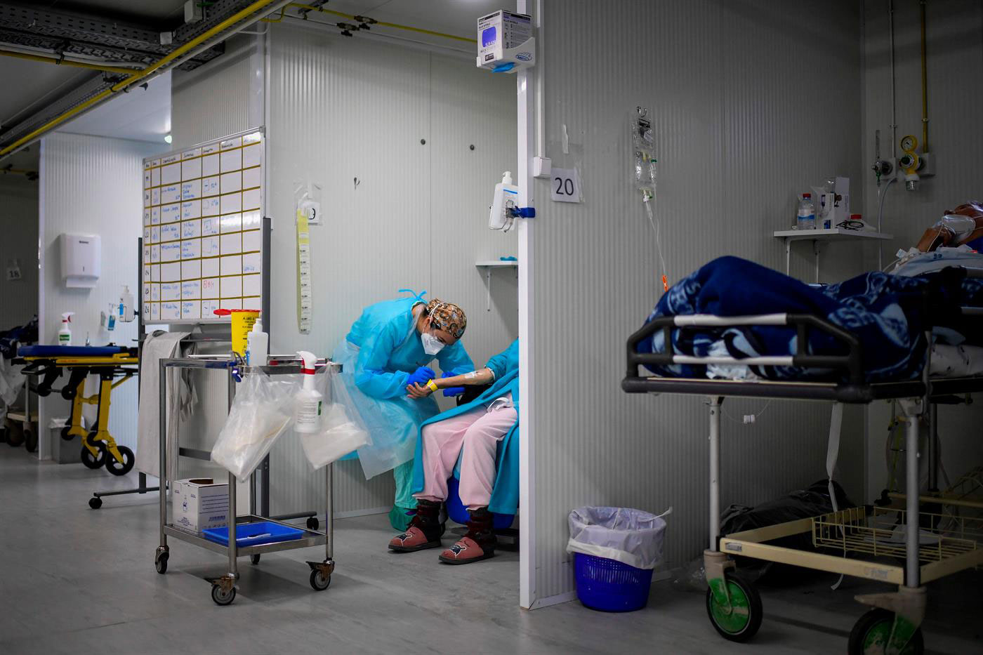 یکی از اعضای کادر درمان در کنار یکی از مبتلایان به ویروس کرونا در بیمارستان «سانتا ماریا» / لیسبون / پرتغال / خبرگزاری فرانسه