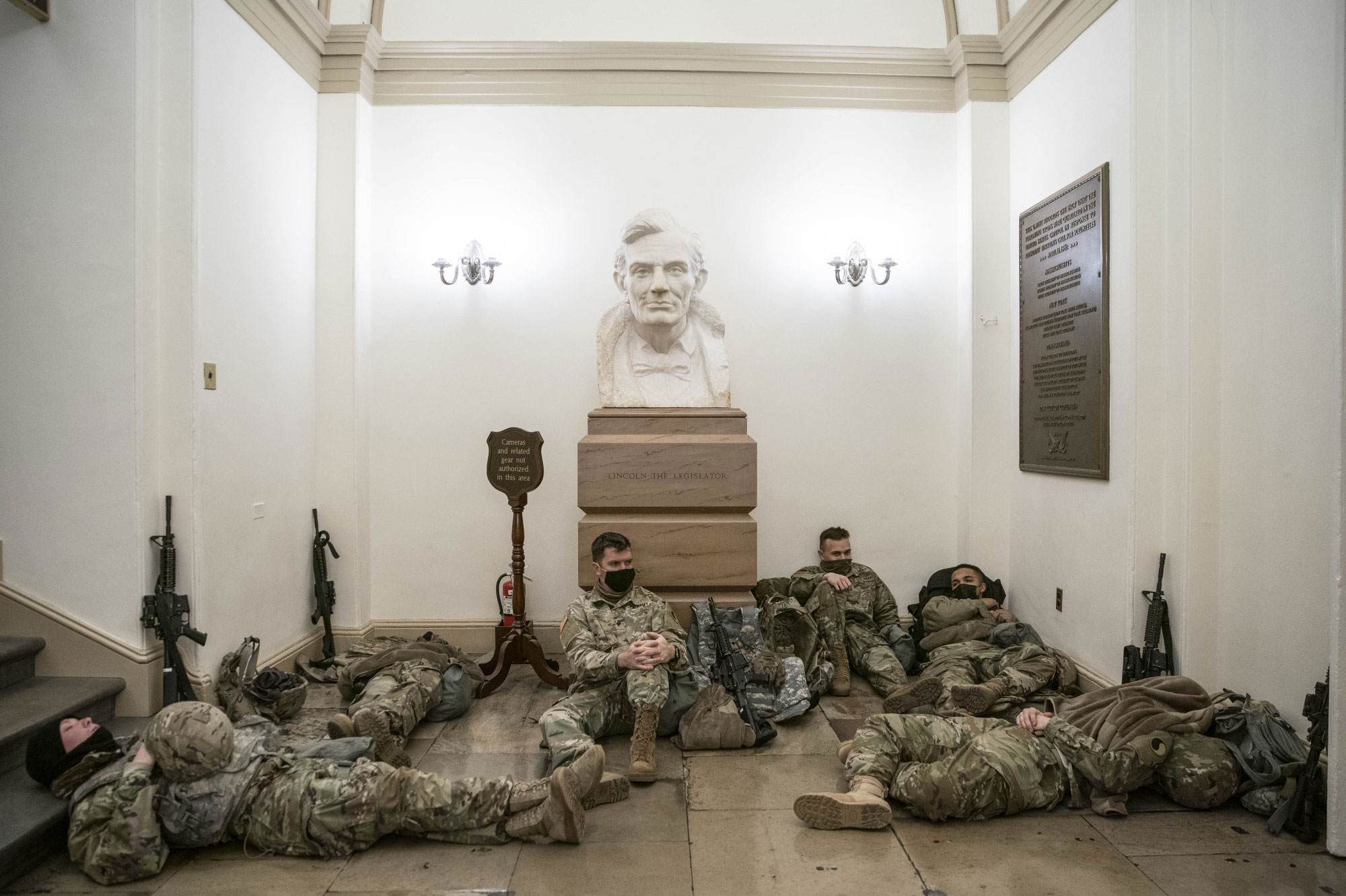 اعضای گارد ملی در سالن ساختمان کنگره آمریکا و در زیر سردیس «آبراهام لینکلن» رئیسجمهور سابق ایالاتمتحده مشغول استراحت هستند / واشنگتن دی سی / بلومبرگ
