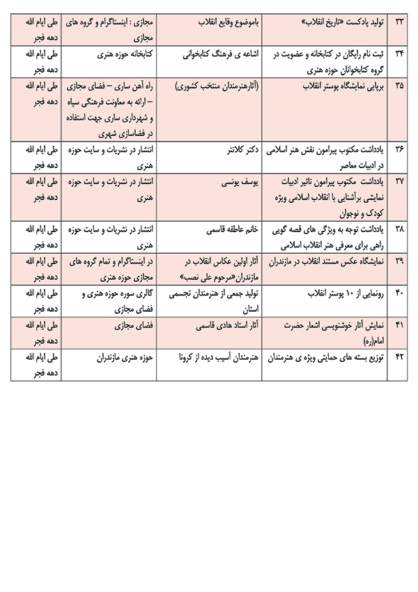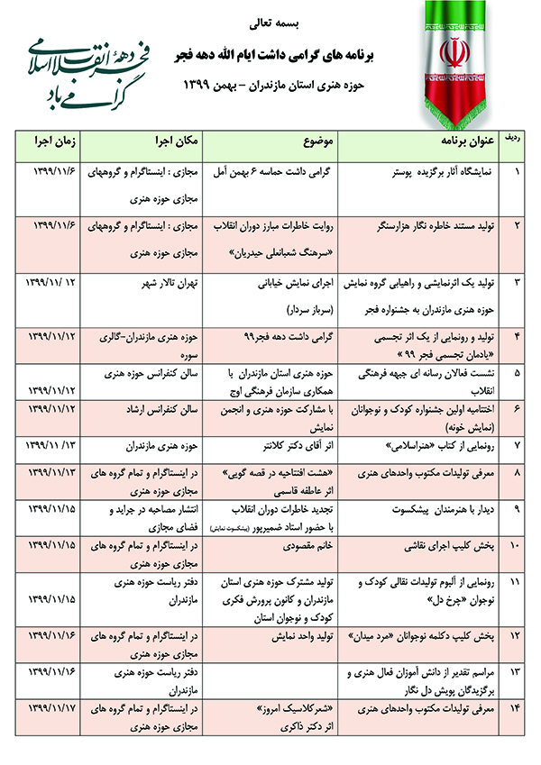 شایان ذکر است که برنامه ها و تولیدات های ایام الله دهه فجر انقلاب اسلامی حوزه هنری مازندران در سال 99 در قالب هنرهای تجسمی، نمایشی، پژوهشی، موسیقی، ادبی، تصویری، کتابخانه ای و تولیدات مجازی می باشد.
