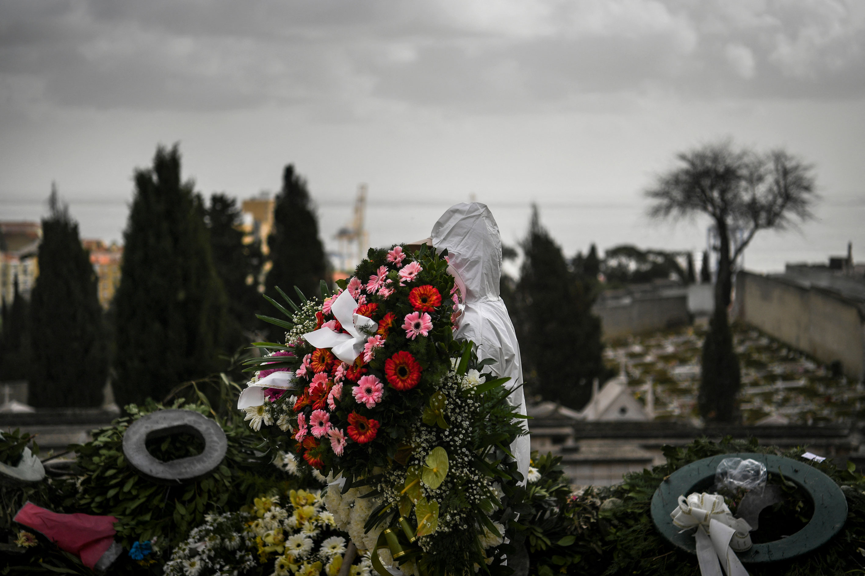 یکی از کارکنان گورستانی در «لیسبون» پیش از دفن یکی از قربانیان «کووید-۱۹» یک حلقه گل را جا به جا می‌کند. پرتغال، در ماه ژانویه، بیشترین آمار ابتلا به ویروس کرونا در جهان را به ثبت رساند و از ۱۵ ژانویه نیز قرنطینه سراسری در این کشور به اجرا درآمد./ پرتغال / خبرگزاری فرانسه