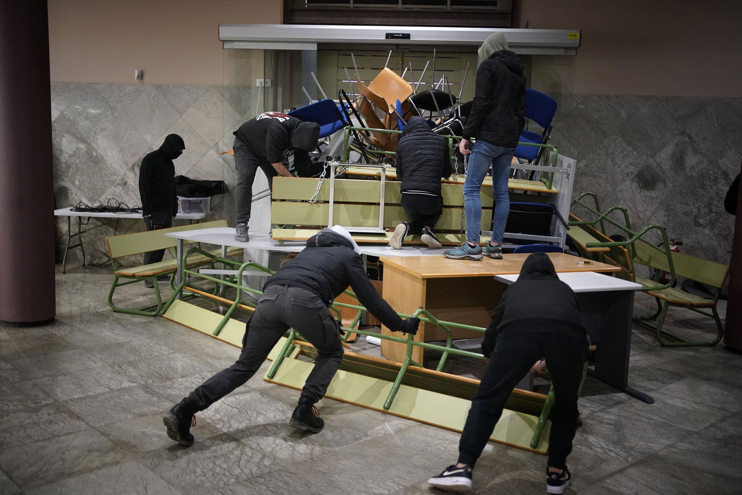 تصویری از حامیان «پابلو هاسل» (رپر اسپانیایی) که راه ورود در دانشگاهی را مسدود می‌کنند. این رپر که به اتهام توهین به پادشاه و حمایت از گروه‌های تروریستی به زندان محکوم شده است، به همراه ده‌ها طرفدارش در آخرین تلاش‌ها برای ممانعت از زندان رفتن در یک دانشگاه بست نشستند. / لریدا / اسپانیا / اسوشیتدپرس