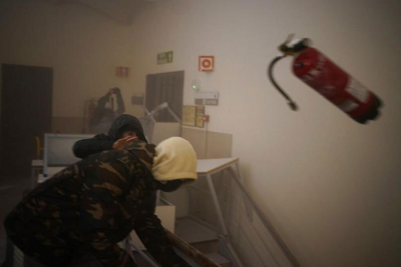 طرفداران «پابلو هاسل» رپر اسپانیایی کپسول اطفا حریق را به سمت پلیس که قصد ورود به دانشگاه دارد پرتاب می‌کنند./ لریدا / اسپانیا / اسوشیتدپرس