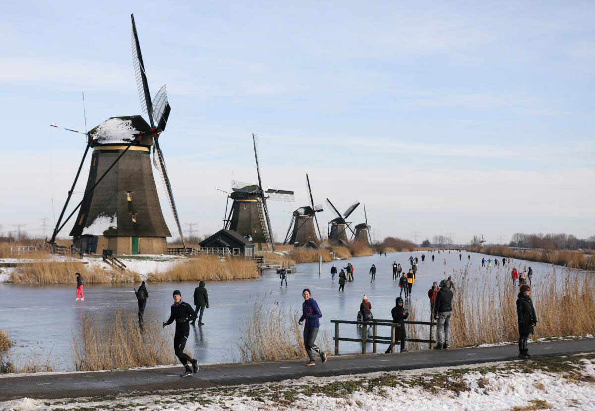 تصویری از افرادی که در کنار آسیاب‌های بادی «کیندردیک» مشغول اسکیت روی یخ هستند./ هلند/ رویترز