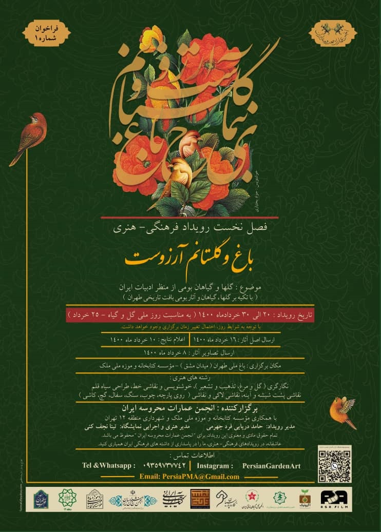 انجمن عمارات محروسه ایران با حمایت مؤسسه کتابخانه و موزه ملی ملک و شهرداری منطقه 12 (قلب طهران)، در نظر دارد نخستین نمایشگاه دوره ای سالیانه آثار هنری با موضوع گلها وگیاهان بومی ایران را به مناسبت روز ملی گل و گیاه (25 خرداد) از تاریخ 20 تا 30 خردادماه 1400 برگزار کند.