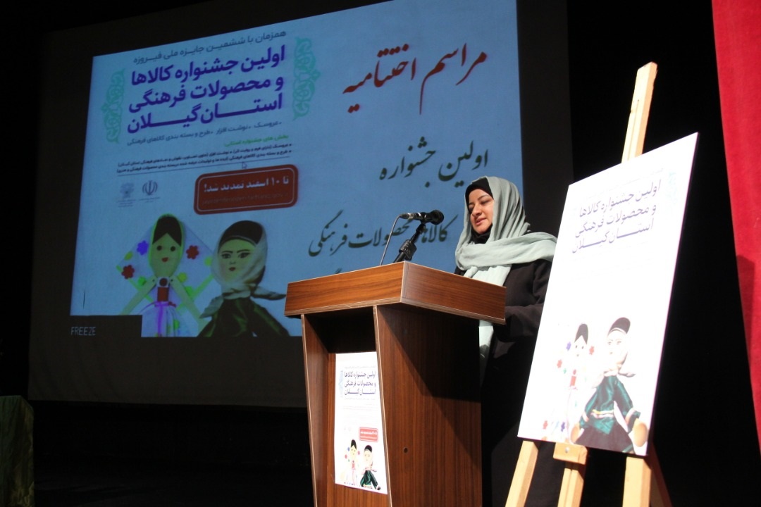 در پایان آیین اختتامیه اولین جشنواره کالاها و محصولات فرهنگی استان گیلان از زهراطاهری نیا رتبه سوم ، انسیه شمسی رتبه دوم وسیده زهرا موسوی رتبه اول در بخش عروسک، سمیه منجم رتبه سوم، مریم پورفضل رتبه دوم، مینا رحیماد فومنی رتبه اول در بخش نوشت افزار ، مرضیه علیزاده رتبه سوم، علی اکبرمطلق زاده رتبه دوم و نیلوفر نیک قلب رتبه اول در بخش بسته بندی کالا ،از سیده منصوره قیمی ، امیرثابت و نوشین نقوی داوران بخش عروسک، شهناز فرخزاد، فائزه شناورماسوله و پریسا لطیفی داوران بخش نوشت افزار و زهرا سمیع املشی، سمیراصفاری و دکتر رضا ابیاک داوران بخش طرح و بسته بندی کالای فرهنگی با اهدای لوح، تندیس و جایزه نقدی از سوی مدیرکل اداره فرهنگ و ارشاد اسلامی گیلان، رییس پژوهشکده گیلان شناسی دانشگاه گیلان، معاون پژوهشی اداره کل فرهنگ و ارشاد اسلامی گیلان ومدیر اداره فرهنگ و ارشاد اسلامی شهرستان رشت تجلیل شد.