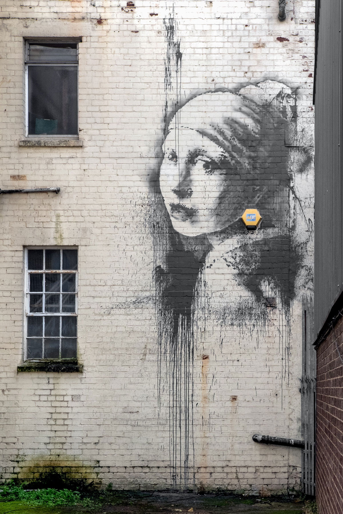 در این اثر که با عنوان دختری با گوش سوراخ شده روی دیواری در بریستول انگلستان کشیده شد، بنکسی از یک جعبه دزدگیر زرد رنگ به عنوان مروارید در این نقاشی بهره گرفته است.