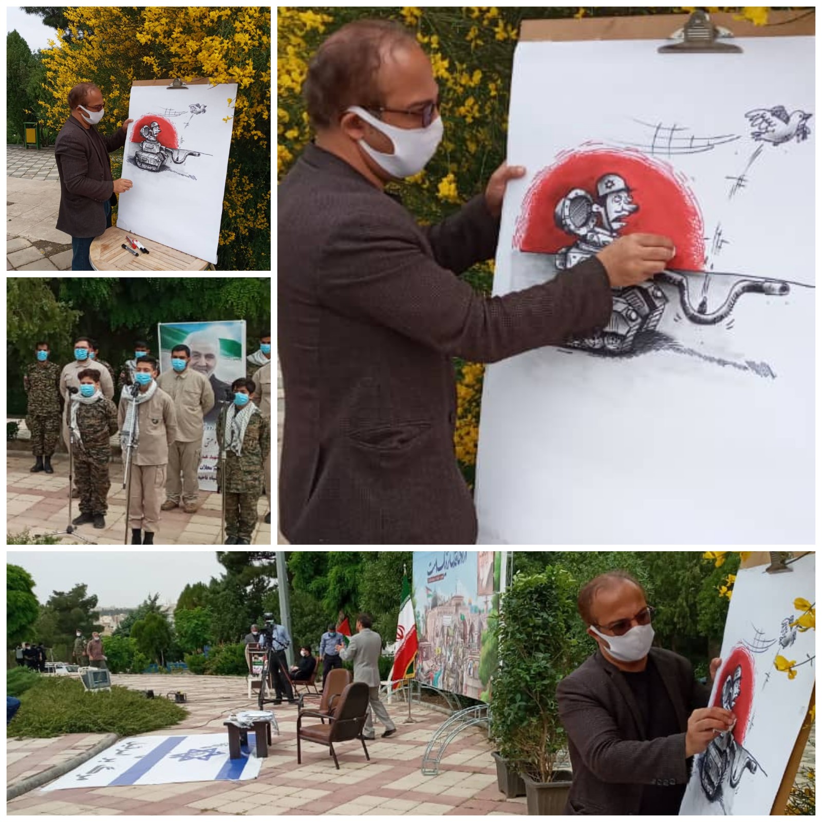در برنامه زنده تلویزیونی که در ساعت ۱۰ صبح همزمان با روز جهانی قدس با مشارکت صدا وسیمای مرکز کرمانشاه، شورای هماهنگی تبلیغات اسلامی، سپاه حضرت نبی اکرم(ص) و حوزه هنری استان و با اجرای گروه سرود و سخنرانی حجه الاسلام جلیلیان مسئول نمایندگی ولی فقیه در سپاه حضرت نبی اکرم(ص) همراه بود، دوست محمد از هنرمندان کرمانشاهی و مسئول خانه کاریکاتور حوزه هنری کرمانشاه با اجرای زنده کاریکاتور به تبیین نقش غاصب رژیم صهیونیست در کودک کشی آوارگان فلسطینی در نوار غزه پرداخت.