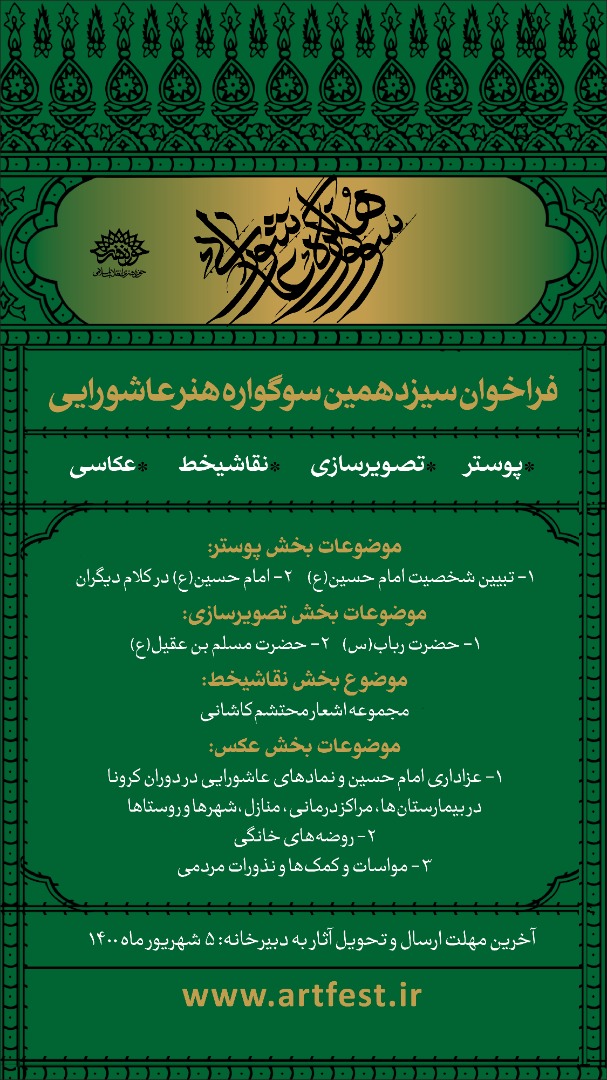 به گزارش پایگاه خبری حوزه هنری، هنرمندان سراسر کشور برای شرکت در سیزدهمین سوگواره عاشورایی که از سوی حوزه هنری انقلاب اسلامی برگزار میشود، میتوانند آثار هنری خود را در ۴ بخش طراحی پوستر، تصویرسازی، نقاشیخط و عکاسی به دبیرخانه این سوگواره ارسال کنند.
