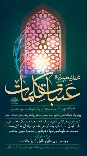 لازم به ذکر است محفل شعر و مرثیه « عتبات کلمات» از ۱۲ تا ۱۴ مهرماه ساعت ۱۹ در رواق شهدای حوزه هنری واقع در خیابان سمیه نرسیده به خیابان حافظ برگزار میشود.