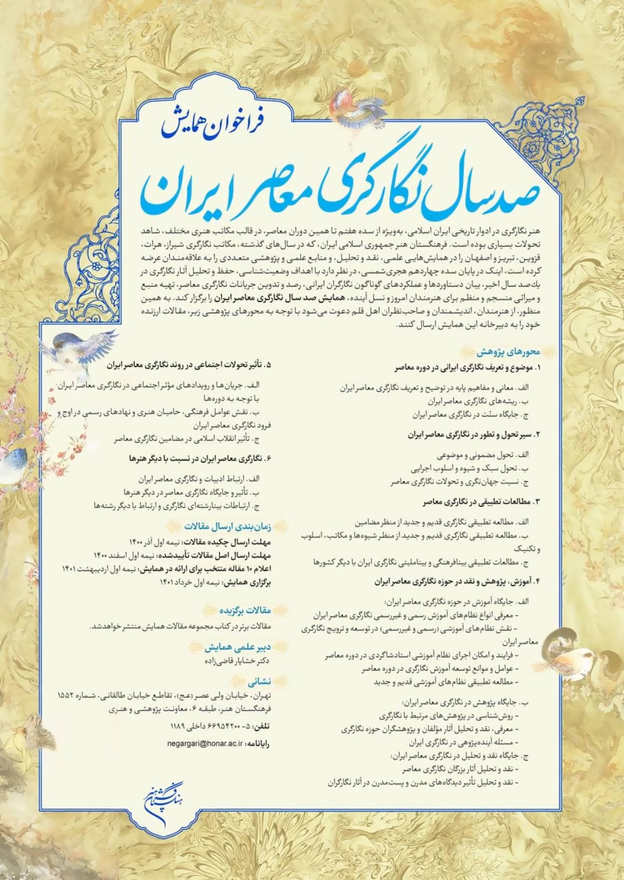 هنرمندان، اندیشمندان و صاحبنظران اهل قلم میتوانند یافتههای پژوهشی خود را حول محورهای مطالعاتی همچون «موضوع و تعریف نگارگری ایرانی در دوره معاصر»، «سیر تحول و تطور در نگارگری معاصر ایران»، «مطالعات تطبیقی در نگارگری معاصر»، «آموزش، پژوهش و نقد در حوزه نگارگری معاصر ایران»، «تأثیر تحولات اجتماعی در روند نگارگری معاصر ایران» و «نگارگری معاصر ایران در نسبت با دیگر هنرها» به دبیرخانه علمی این همایش ارسال کنند.