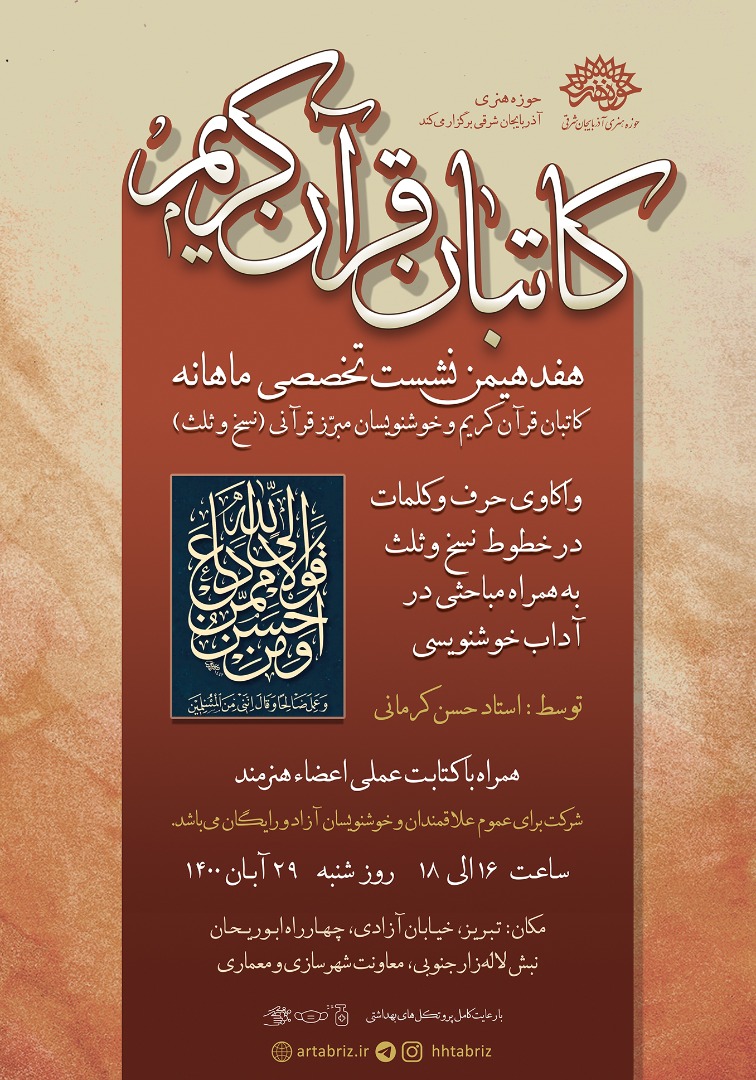 گفتنی است، شرکت برای عموم علاقمندان و خوشنویسان آزاد و رایگان است و این نشست همراه با کتابت اعضای شرکت کننده در جلسه ادامه پیدا خواهد کرد.
