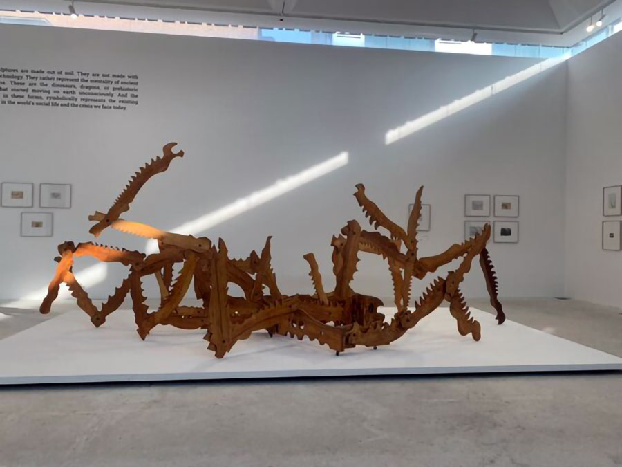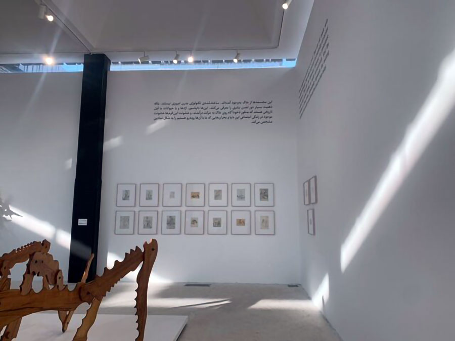 در طبقه دوم و در گوشه سمت راست دیوار، با خطی درشت چنین نوشته شده است: «این مجسمه‌ها از خاک به وجود آمده‌اند. ساخته شده‌ی تکنولوژی مدرن امروزی نیستند، بلکه ذهنیت بسیار دور تمدن بشری را معرفی می‌کنند. این‌ها دایناسور، اژدها و یا حیوانات ما قبل تاریخی هستند که به‌طور ناخودآگاه روی خاک به حرکت درآمدند. خشونت این فرم‌ها خشونت موجود در زندگی اجتماعی این دنیا و بحران‌هایی که ما با آن‌ها روبه‌رو هستیم را به شکل نمادین مشخص می‌کند.»