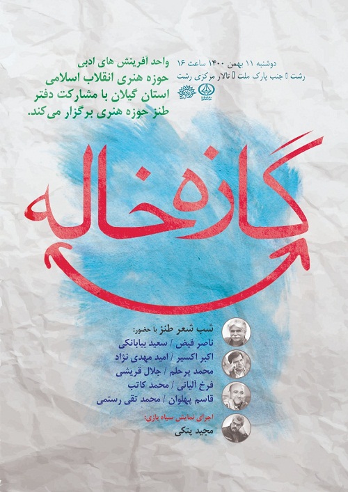 به گزارش روابط عمومی دفتر طنز حوزه هنری شب شعر طنز گازهخاله به همت دفتر آفرینشهای ادبی حوزه هنری استان گیلان و دفتر طنز حوزه هنری برگزار میشود.