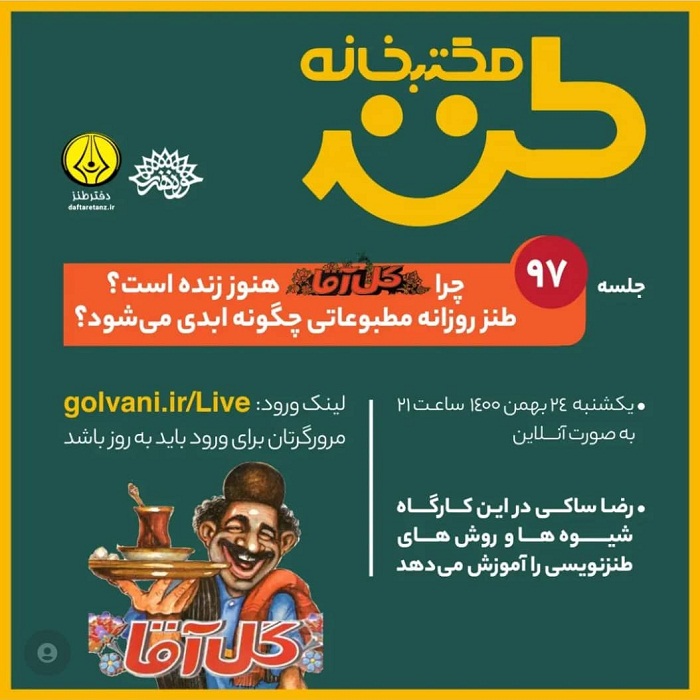 به گزارش روابط عمومی دفتر طنز حوزه هنری 97ﺍُمین ﺟﻠﺴﻪ «ﻣﮑﺘﺐﺧﺎﻧﻪ ﻃﻨﺰ» یکشنبه 24 بهمنماه 1400ساعت 21 به صورت مجازی و برخط ﺑﺮﮔﺰﺍﺭ میشود.