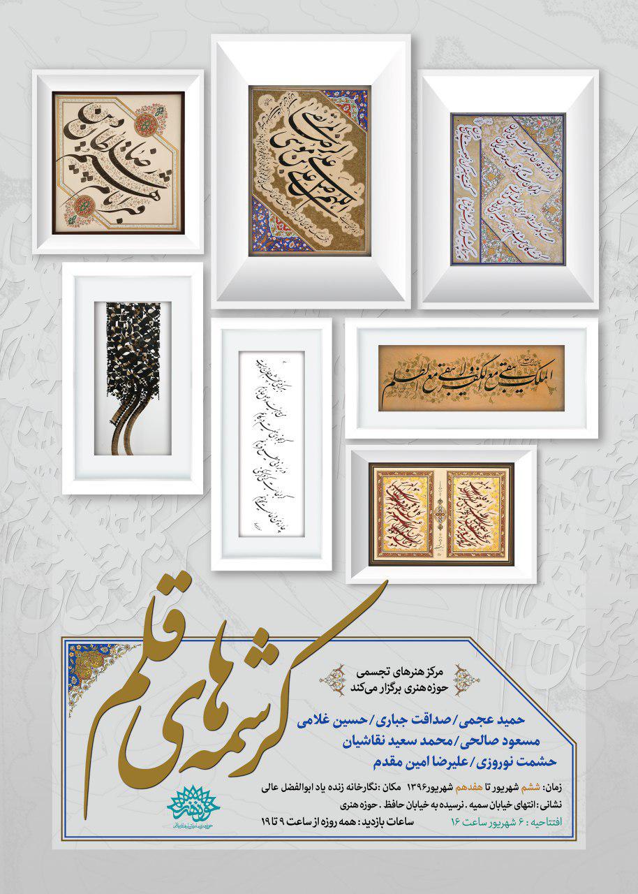 بنا بر این گزارش نمایشگاه کرشمه های قلم روز دوشنبه ششم شهریورماه از ساعت 16 در نگارخانه عالی حوزه هنری واقع در خیابان سمیه نرسیده به خیابان حافظ، با حضور هنرمندان و علاقهمندان به هنر خوشنویسی افتتاح خواهد شد. این نمایشگاه تا روز هفدهم شهریورماه همه روزه از ساعت 9 صبح تا 19 عصر پذیرای عموم علاقهمندان است.