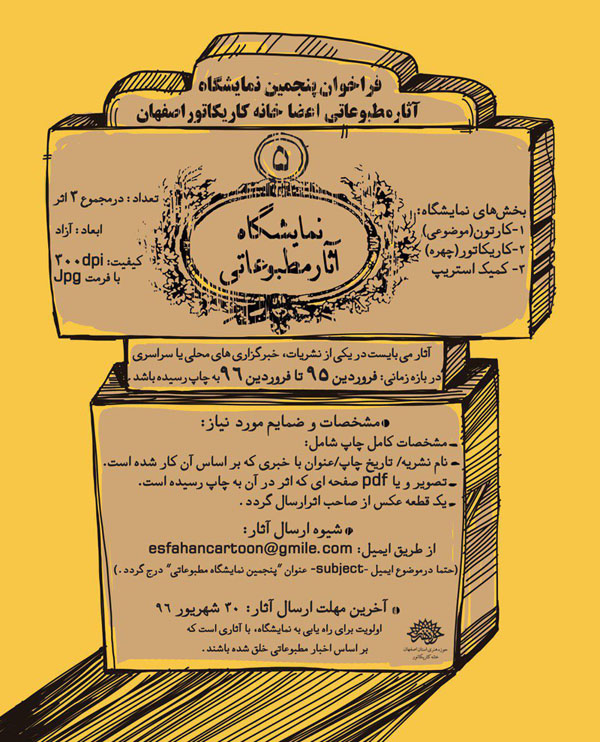 پنجمین نمایشگاه آثار مطبوعاتی اعضای خانه کاریکاتور اصفهان در سه بخش ۱ - کارتون(موضوعی)، ۲ - کاریکاتور(چهره)، ۳ - کمیک استریپ دایر می شود.