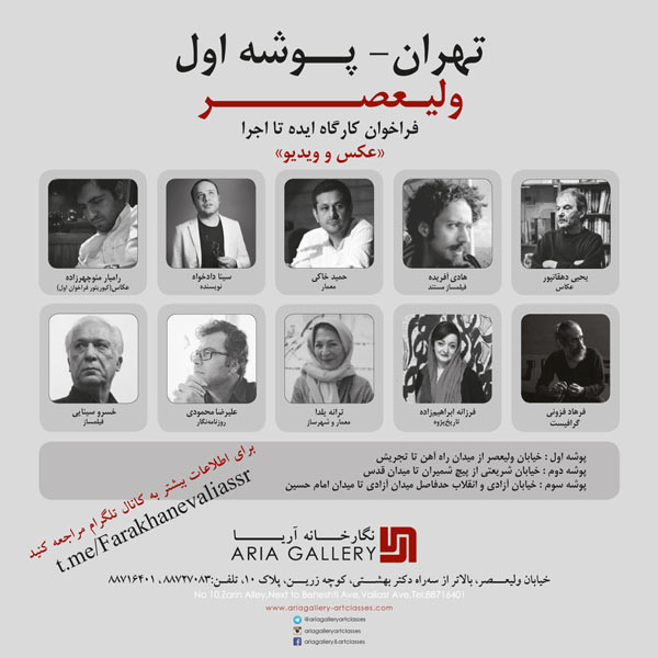 نگارخانه آریا در نظر دارد با همکاری هنرمندان در حوزه عکس و ویدیو شریان های اصلی و مهم شهر تهران را بر اساس اهمیت فرهنگی، اجتماعی و سیاسی آن در سه محور و در سه دوره زمانی مختلف، در قالب برگزاری دوره‌های کارگاهی معرفی و بازنمایی کند. در پایان این دوره، نمایشگاهی از آثار منتخب شرکت کنندگان در این دوره‌ها برگزار خواهد شد.