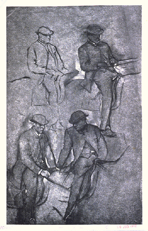 در ابتدا آرزو داشت نقاشی تاریخی شود. دگا که اگنر را ستایش میکرد، نزدیکی از پیروان اگنر به تحصیل پرداخت و در کارهای اولیهاش به طراحی و برجسته سازی اصرار داشت. در سال ۱۸۶۵، دگا وارد محفل مانه و بودلر در کافه گوربو شد و به بازنمایی پاریس مدرن روی آورد. دگا، نگرش نقاشانهای به اشیاء داد که از مانه الهام گرفته بود و همچنین ابزارهای ترکیبی نوآورانه به کار گرفت که به تصاویرش کیفیتی گذرا و خود جوش میبخشیدند و بیننده را در جایگاه تماشاگرانهٔ خیابان گرد نامشهود قرار میداد.