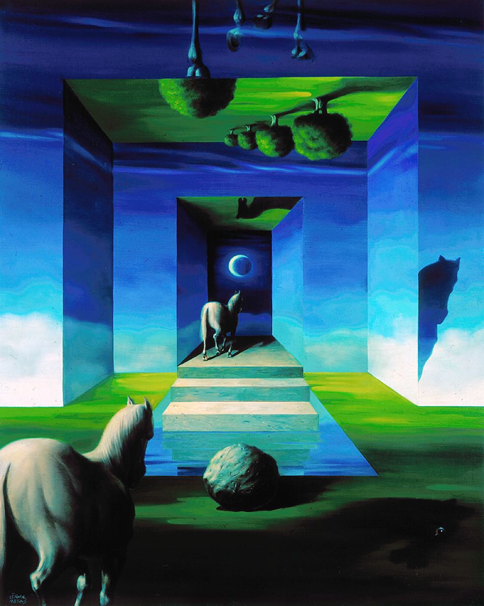 علی اکبر صادقی در نقاشی های خاطره انگیز خود سنت های غنی هنر فارسی را با شیوه سورئال نقاشی ترکیب می کند و با استفاده خارق العاده از رنگ و فرم آثاری شگفت انگیز و سرگیجه آور به وجود می آورد.
