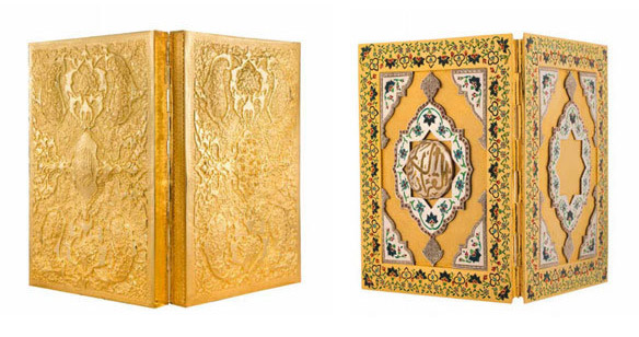 مجموعه بزرگترین و کوچکترین قرآن طلا و نقره جهان به عنوان گران ترین اثر صنایع دستی در این حراج با قیمت پایه ۴ تا ۴ میلیارد و ۲۰۰ میلیون تومان ارایه شده است. بزرگترین قرآن طلا و نقره جهان در ۶۰۴ صفحه توسط رایین اکبر خانزاده با خط عثمان طه نگارش شده است. در ساخت این اثر یک و نیم کیلوگرم شمش طلای ۲۴ عیار، ۱۵ کیلوگرم نقره و ۸۰ کیلوگرم مس به کار رفته است. صفحات این قرآن از نقره خالص و سر سوره های آن طلای ۱۸ عیار است. جلد قرآن از مس ساخته و با طلای ۲۴ عیار آبکاری شده است. قلم زنی این اثر توسط مهدی عسگری، قلم زن عتبات عالیات در اصفهان انجام شده و ساخت آن توسط تیمی ۵۰ نفره به مدت ۲ سال طول کشیده است. کتابت کوچکترین قرآن طلا و نقره جهان نیز توسط رایین اکبر خانزاده انجام شده است. میناکاری جلد این قرآن هنرنمایی اصغر فولادگر است و مدت زمان ساخت این اثر نیز دو سال طول کشیده است.
