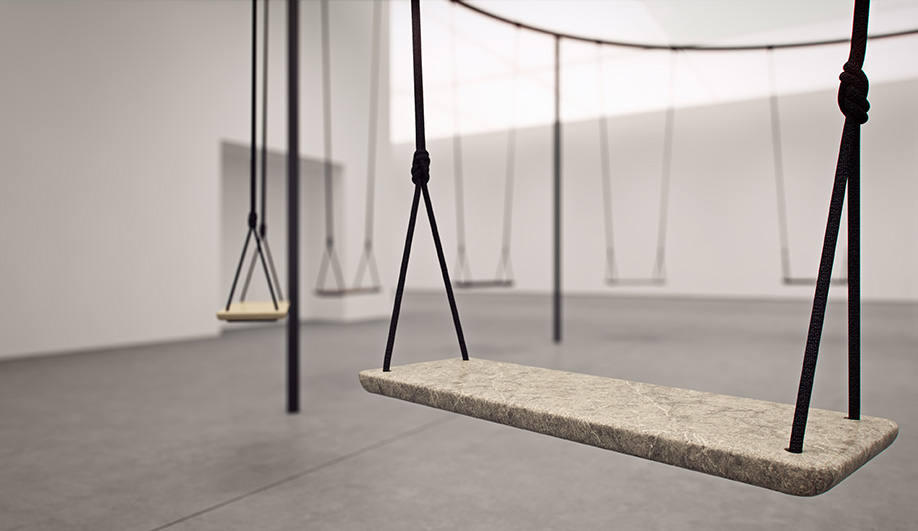 با تغییر در ابعاد و عملکرد مواد، اشیای معمولی به اشیایی عجیب و غریب تبدیل می شوند که با نگاهی دقیق تر خشونت و تهدید پنهان خود را نشان می دهند. برای مثال، تاب هایی که صندلی های فلزی لبه تیز دارند یا یک ویلچر که به جای دسته اش چاقو قرار دارد.
