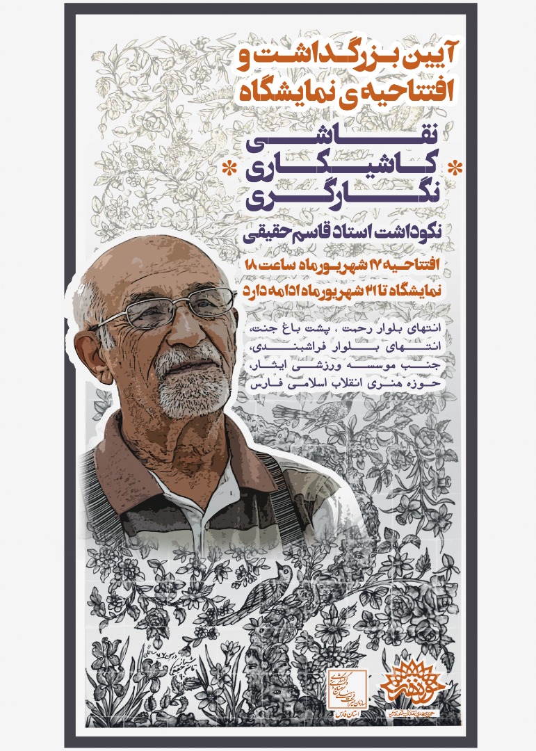 آیین افتتاح نمایشگاه نقاشی کاشیکاری و نگارگری و نکوداشت قاسم حقیقی از ساعت ۱۸ روز شنبه ۱۷ شهریورماه در انتهای بلوار رحمت غربی پشت باغ جنت انتهای بلوار فراشبندی جنب موسسه ورزشی ایثار حوزه هنری انقلاب اسلامی استان فارس برگزار می شود و حضور علاقه مندان در آن آزاد است. نمایشگاه فوق نیز تا ۲۱ شهریورماه ادامه دارد.