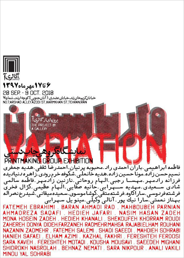 نمایشگاه گروهی چاپ دستی «واریاسیون» یکی از پروژه‌های سالانه گالری آ است که به کوشش مرتضی آکوچکیان و آیدین خانکشی‌پور جمع‌آوری شده است و تا ۱۷ مهرماه برقرار است. در استیتمنت این نمایشگاه به قلم آسیه مزینانی آمده است: «تجربه ایرانی، میان گذشته‌های درخشان و اکنون اغلب بی‌ثمر و کم فروغ، ثابت کرده و می‌کند که بی‌کنکاش در چند و چون خلق هنری دیروز و استمرار کنجکاوی و عمل امروز نمی‌توان قله تازه‌ای را فتح کرد. این همان اصلی است که روند چشمگیر و رو به پیشرفتی را برای چاپ دستی ایران رقم زده است. مرور و بازنگری آثار کم نظیر ایرانی و غیرایرانی در کنار شناخت ابزارها و تکنیک‌ها آغازگر راهی بوده که جایگاه چاپ‌دستی امروزمان را به شکل روزافزونی مرتفع‌تر ساخته است.