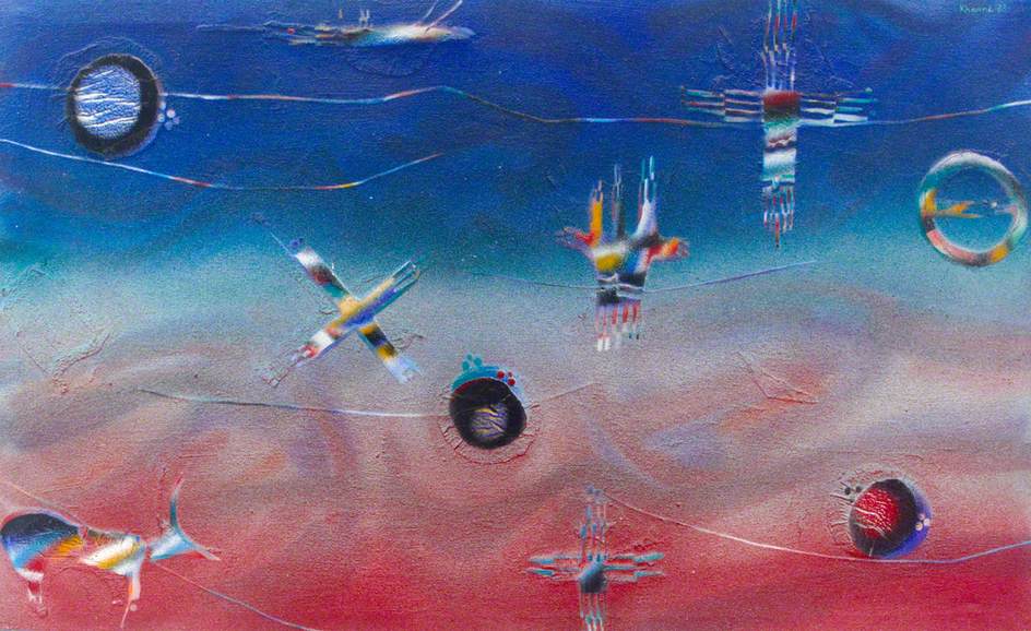 "بالراج کاننا" (Khanna Balraj)، نقاش و نویسنده هندی متولد سال 1940 است. او از اعضای انجمن منتقدان بین المللی هنرِ بخش بریتانیا و انجمن نویسندگان است. او به طور اتفاقی به نقاشی روی آورد اما نقاشی هایش آمیزش منحصر به فردی از رنگ و شکل است. او در سال 1962 به انگلیس رفت تا تحصیلات خود را در ادبیات انگلیسی در دانشگاه آکسفورد ادامه دهد، اما بنا به دلایلی موفق نشد. او یک نقاش خودآموخته است، اما چنان نظم و انضباطی در کارهایش مشهود است که به نظر می آید در یک آکادمی معتبر تحصیل کرده است. آثار او نوعی فانتزی در خود دارند، اشیایی در نقاشی هایش دیده می شوند که انگار در اقیانوس یا آسمان معلقند. در بعضی جاها نمادهایی از سحر و جادو دیده می شود. "کاننا" از شن و ویژگی هایش در آثارش استفاده میکند که سبک شخصی اوست. او بهترین ماسه را برای خلق آثارش پیدا میکند.و آن را با بتون ترکیب می کند تا بتواند نرم ترین موج ها را به تصویر بکشد. این شیوه بهترین راه است برای نشان دادن تیرگی و روشنایی ها، نقاط رنگی در کنار هم، که ممکن است از دور شما را به یاد سبک پوانتیلیسم بیاندازد. آثار "کاننا" تحت تاثیر نور هستند. در کارهای او جنبه اغواکننده و عجیبی وجود دارد، به نظر می آید که اشکال با رنگدانه های خالص در حال درخشیدن و سوختن هستند. "کاننا" می گوید: همه هنرمندان باید ریاضیدان نیز باشند، زیرا در جهان همه چیز بر اساس نظم و انضباط شکل گرفته است. او معتقد است هنرمند مانند یک کیمیاگر مواد مختلف را ترکیب و تجربه می کند تا به بهترین نتیجه که مثل طلا گرانبهاست برسد.