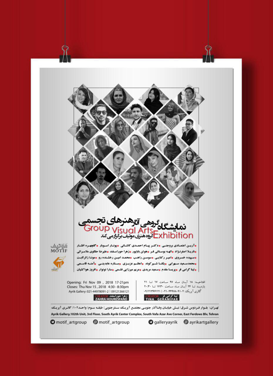 نمایشگاه گروهی آثار هنرهای تجسمی گروه «موتیف» روز جمعه مورخ ۱۸ آبان ماه 97 افتتاح ‌شد و تا ۲۴ آبان ماه از ساعت ۱۶:۳۰ تا ۲۰:۳۰ پذیرای علاقمندان است.