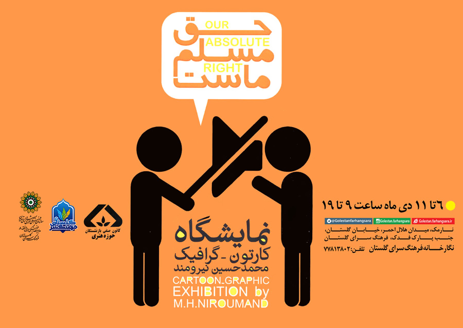 نمایشگاه آثار محمدحسین نیرومند با عنوان «حق مسلم ماست» تا روز سه شنبه ۱۱ دی ماه از ساعت ۹ تا ۱۹ در نگارخانه فرهنگسرای گستان واقع در نارمک، میدان هلال احمر، خیابان گلستان، فرهنگسرای گلستان دایر است.