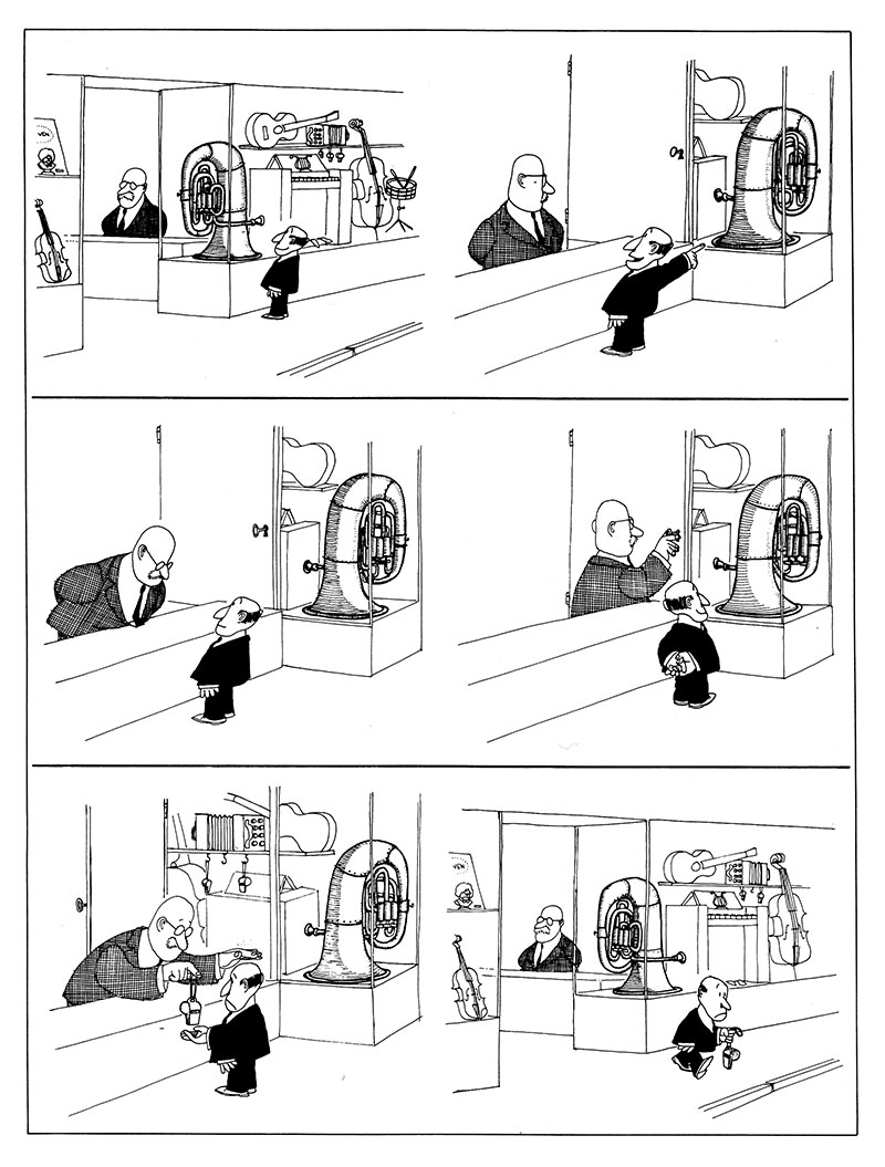 ب) خریدار به ترومپت خیره شده است. نگاه خریدار، بیننده را وادار میکند تا از میان انبوه اشیا درون ویترین، ترومپت را به عنوان یکی دیگر از عناصر اصلی ماجرا بپذیرد. کینو، تنها به این نکته اکتفا نکرده، او در میان اشیا درون ویترین، تنها ترومپت را با هاشور طراحی کرده است.